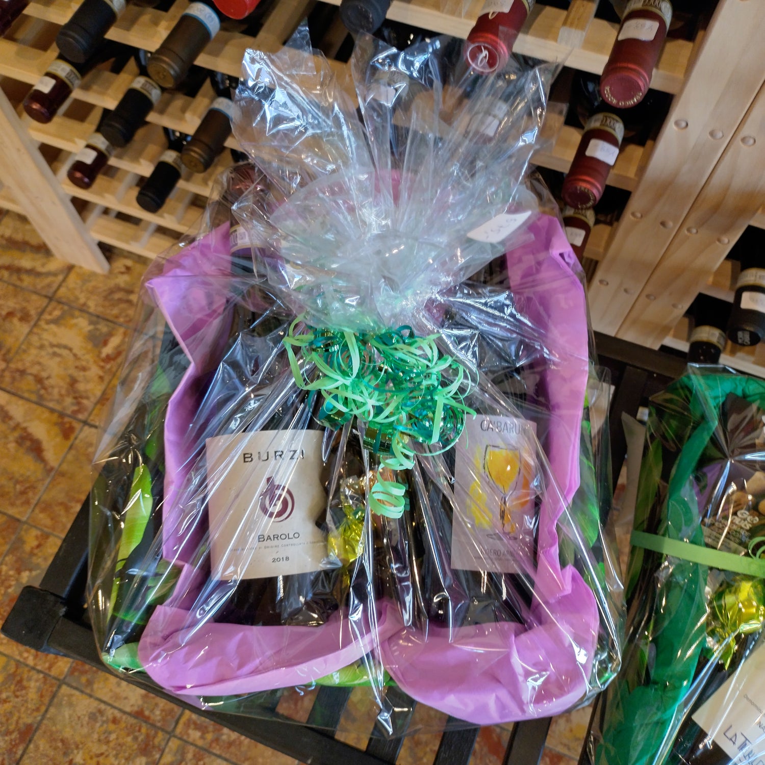 Vi laver gavekurve i forskellige udgaver. Dels den enkle med flasker og så den mere nuancerede med vin, chokolade, og andet godt.